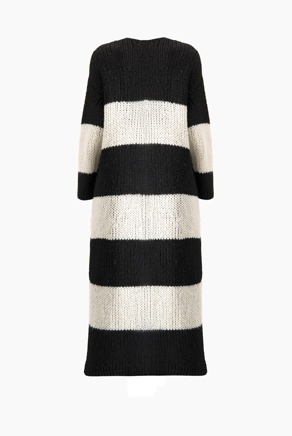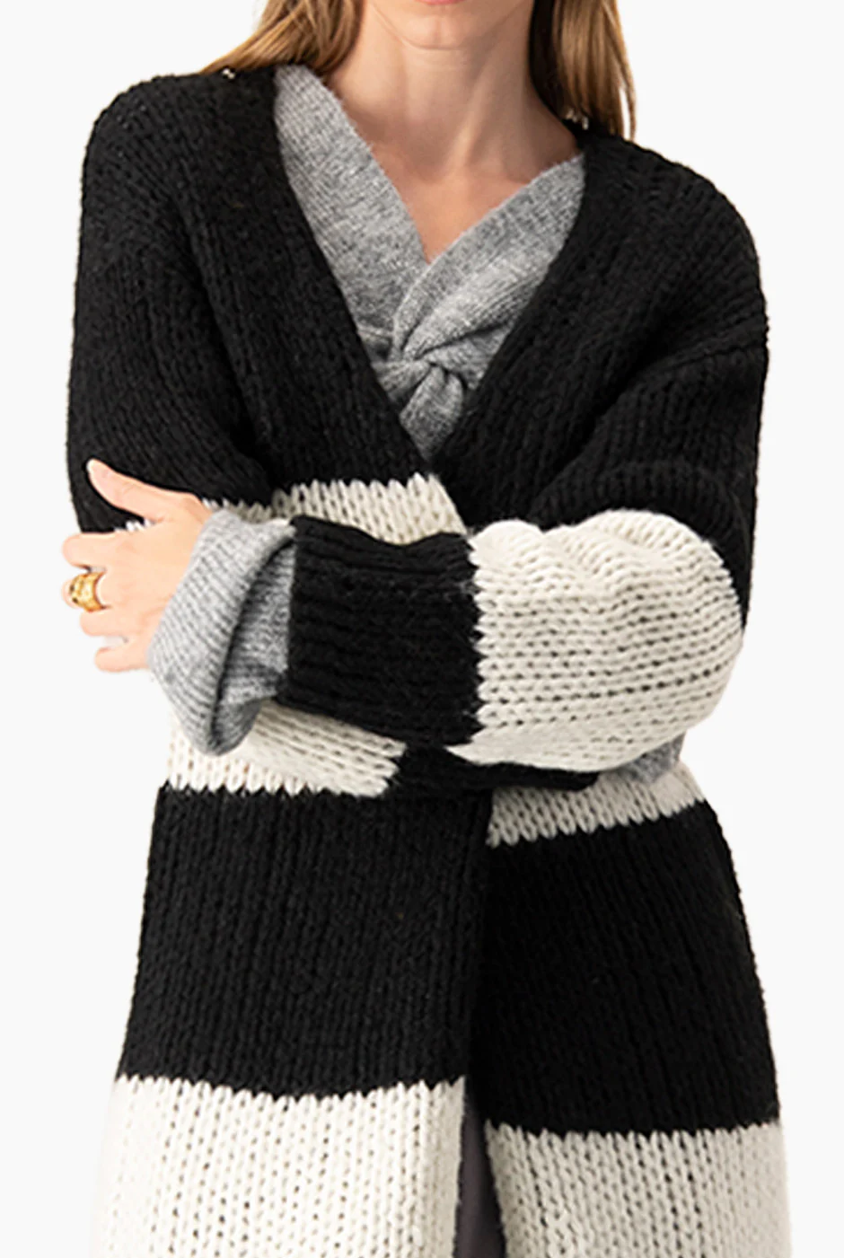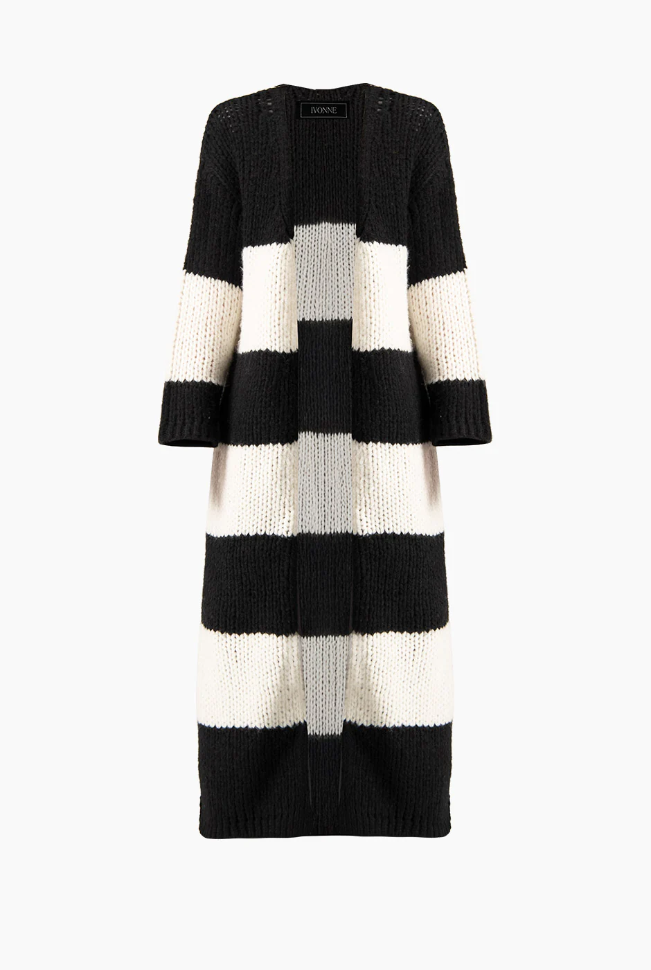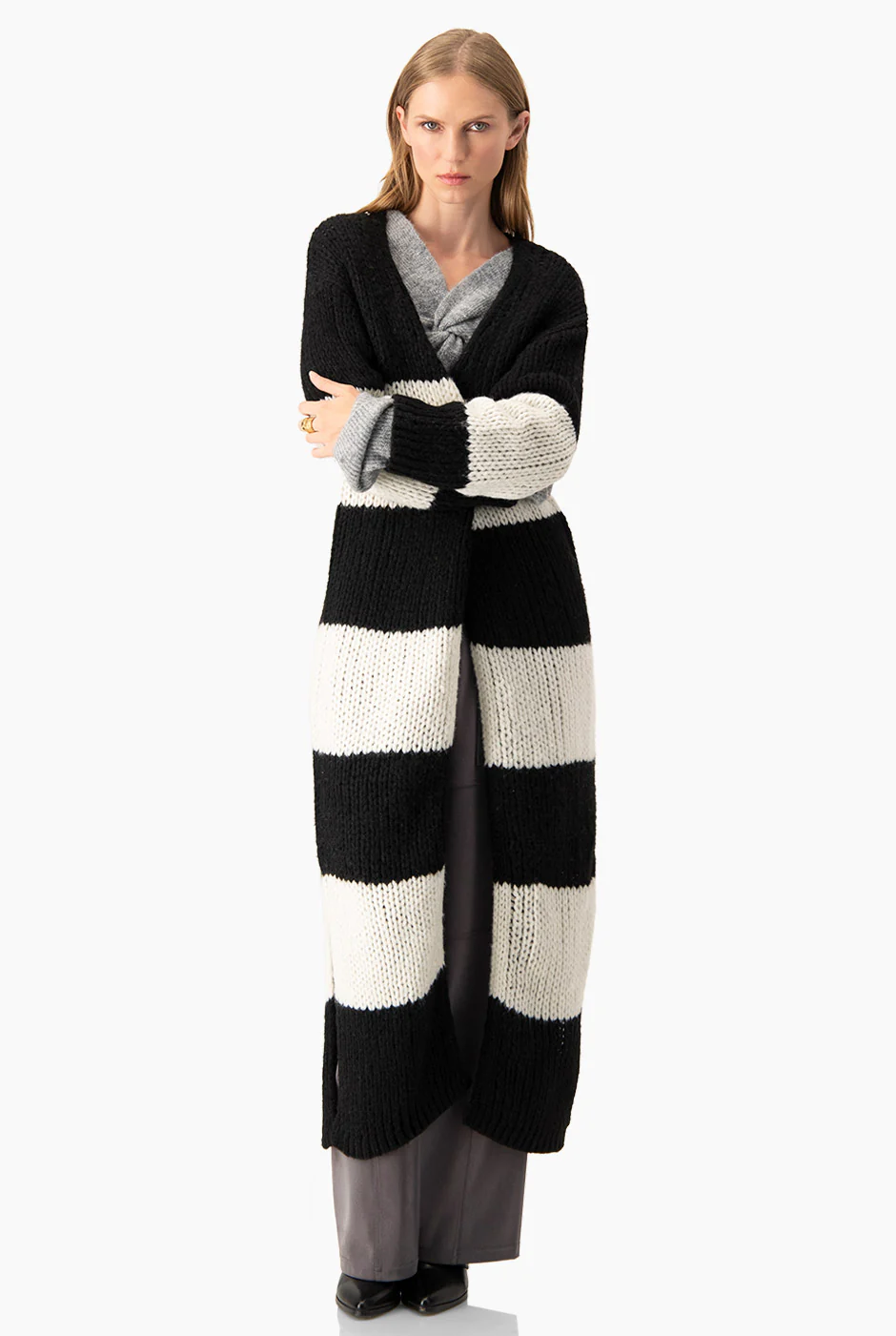 Cárdigan largo tejido crochet, con rayas negras y blancas, silueta suelta, ideal para el otoño.