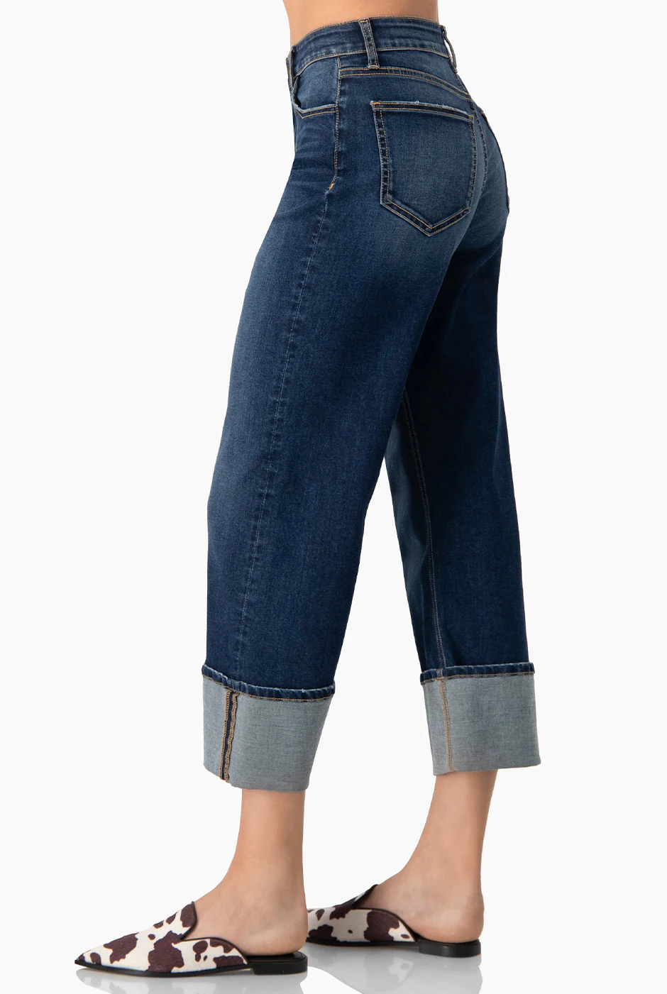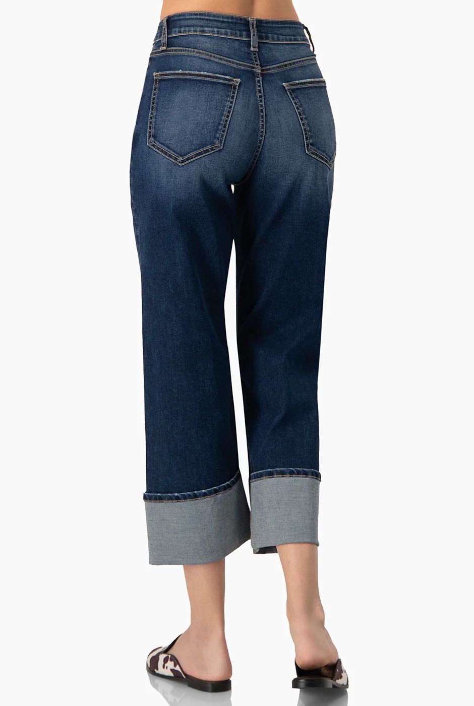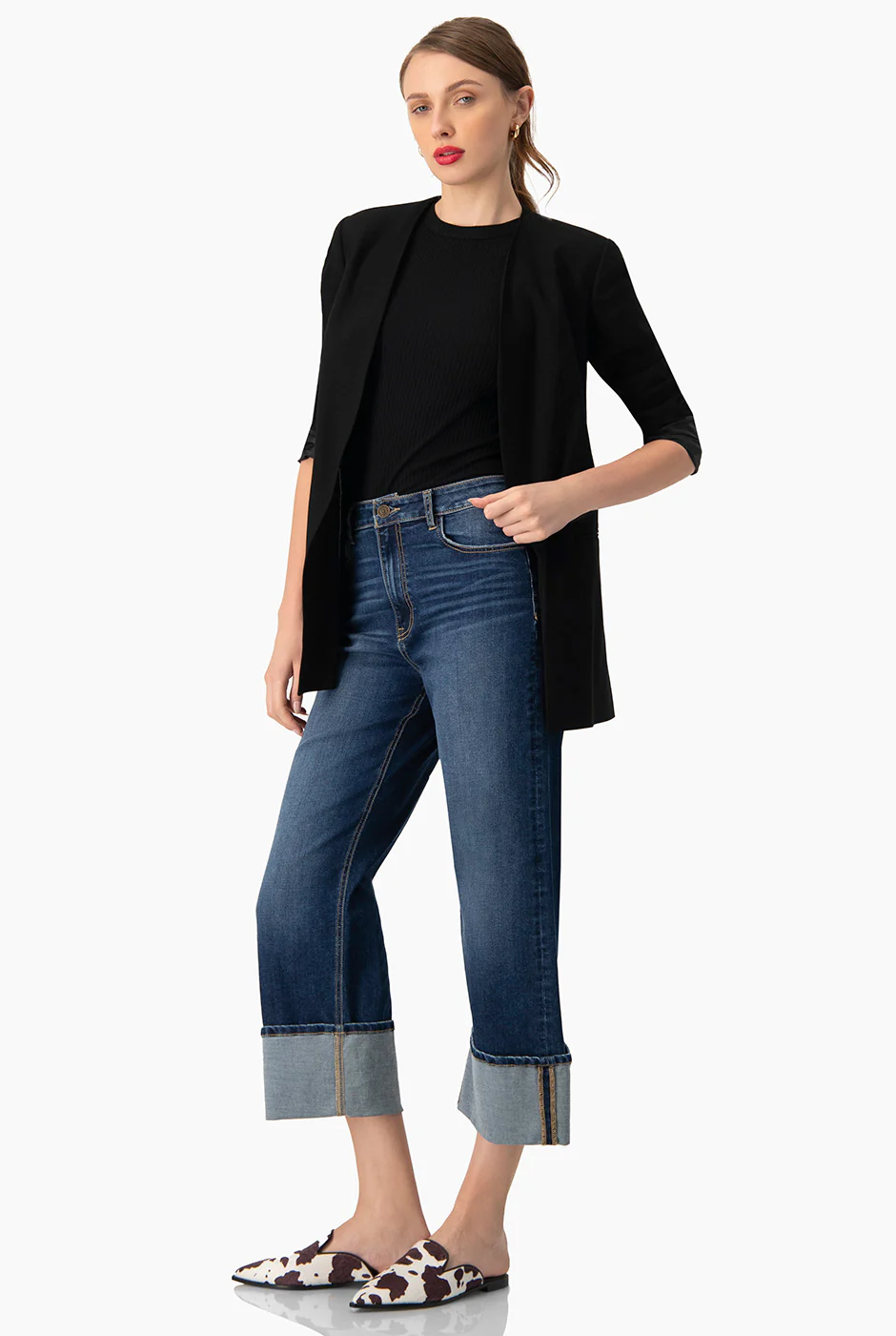 Jeans recto azul con bolsillos de parche y dobladillo vuelto. Silueta suelta para un estilo casual.
