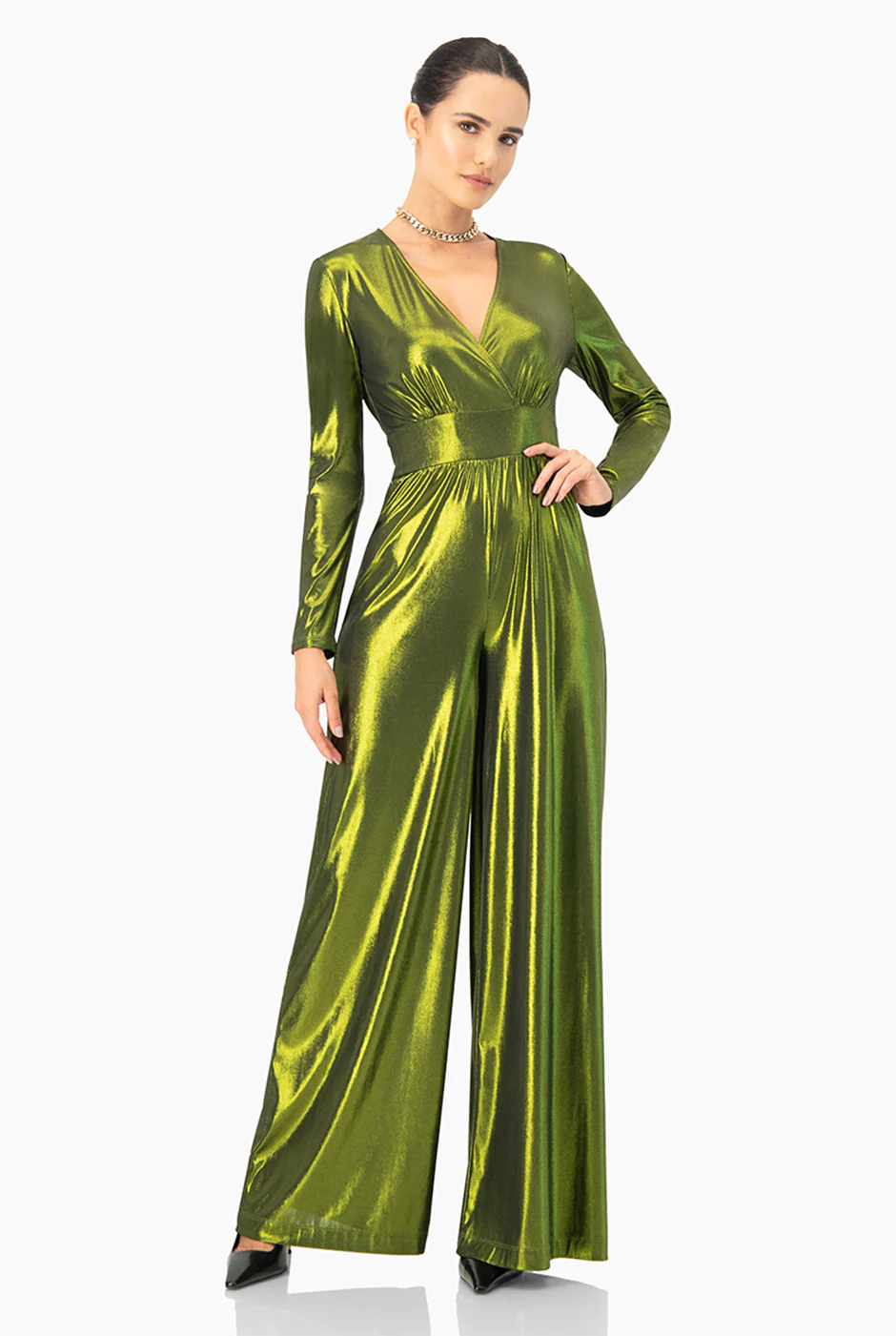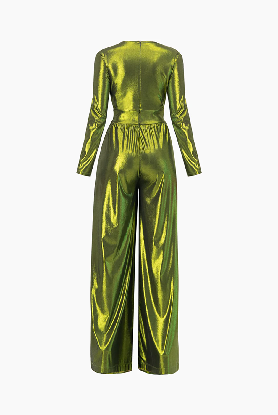 Jumpsuit verde olivo con escote en V, mangas largas y silueta suelta. Ideal para un look elegante.